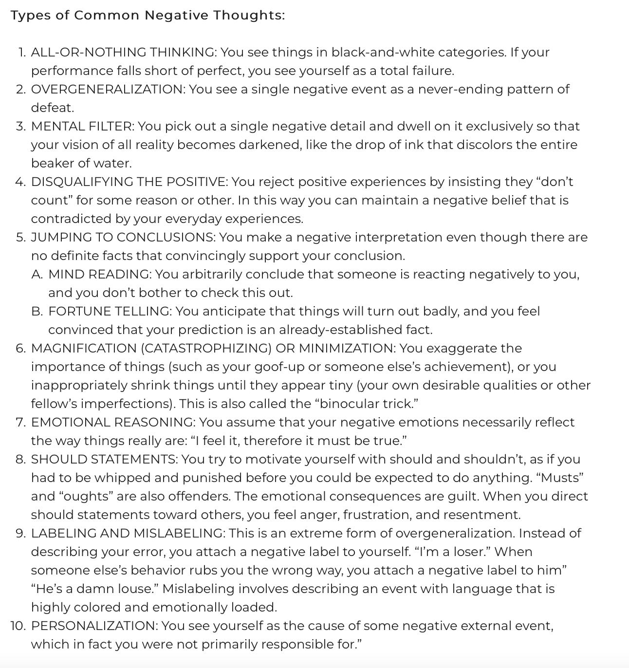 Other techniques to encourage mindfulness and overcoming negative emotions include various journaling techniques. Additionally, Harvard recommends “Examining the Evidence” , simply checking your use of language for extremes, bias, or assumptions, and reviewing common negative thinking patterns: